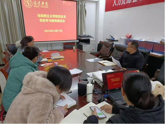 李明建书记结合《宿迁学院党史学习教育考评清单》,带领与会人员逐条学习并核对马院党总支完成情况。李明建书记指出,马院党总支要查漏补缺,进一步加强党史学习教育组织领导,深化专题学习研究,开展“我为群众办实事”等工作。