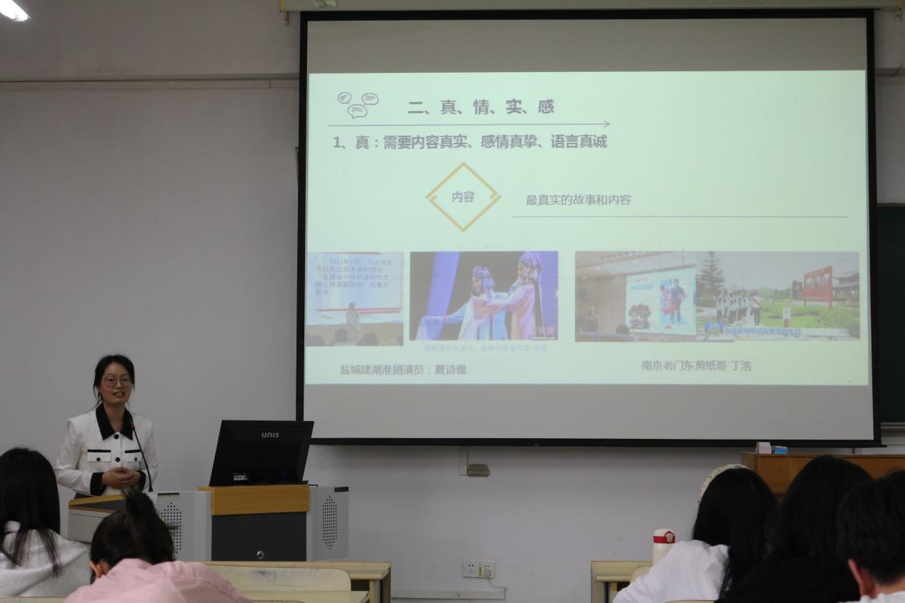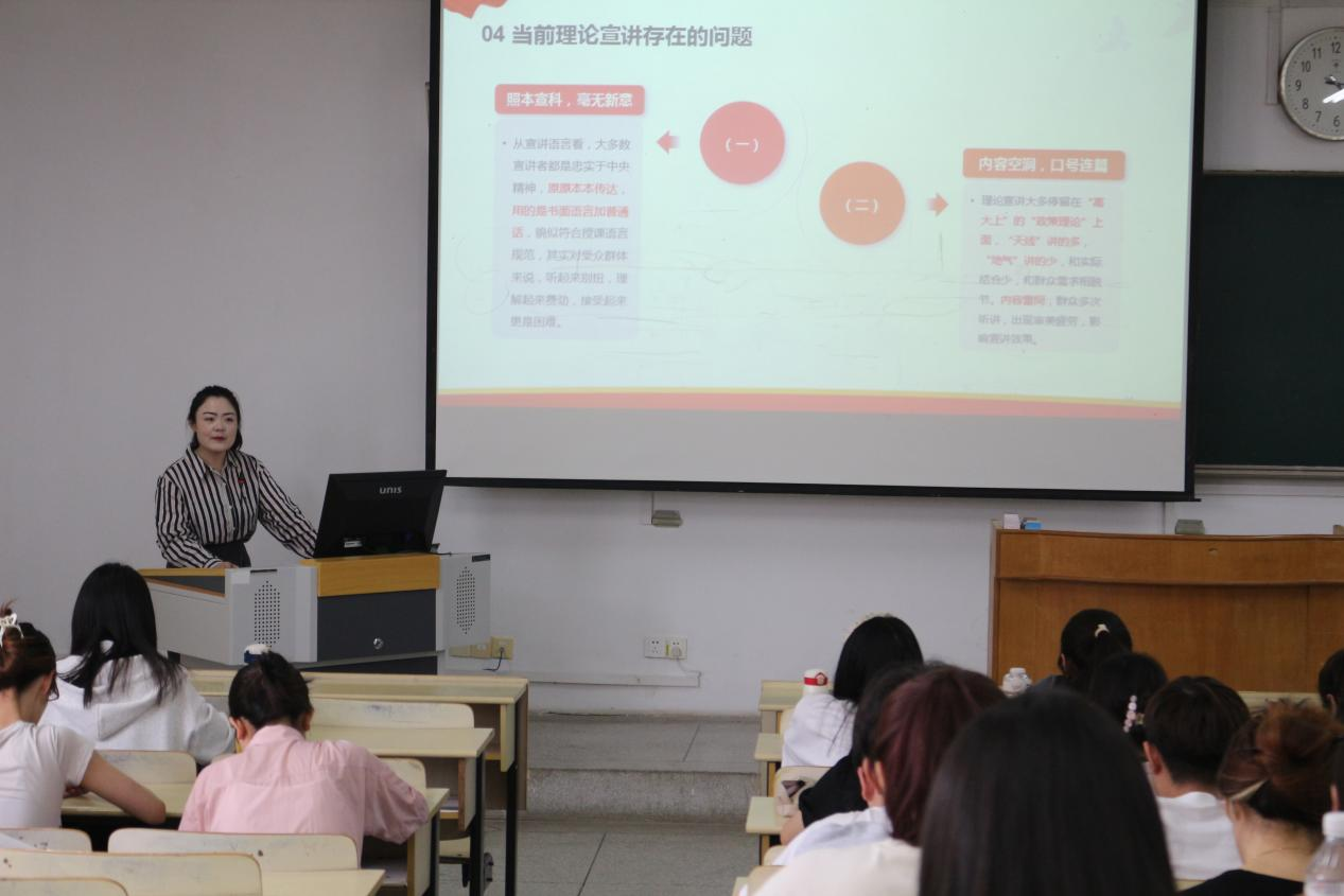 董千千和毕书姝两位老师结合自身经验以及专业知识对学生展开理论宣讲培训。董千千老师以个人的宣讲经历和感受为例,向同学们展示宣讲不仅对于他人,对自己也是一种锻炼和成长。毕书姝老师则与同学们分享了多份稿件以及宣讲视频,强调了在高校进行理论宣讲的重要性。