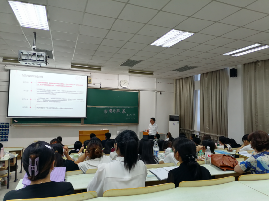 为深入推动思政课建设内涵式发展,扎实推进“形势与政策”课程教育教学改革,充分发挥校领导讲思政课的示范引领作用,6月27日晚上,校长潘志明以“坚决贯彻新时代党解决台湾问题的总体方略扎实推进祖国统一进程”为主题,为2022级英语师范专业的同学们讲授了一堂生动深刻、精彩纷呈的“形势与政策”示范课。马克思主义学院副院长唐献玲、陈丽杰与部分教师代表参加听课。