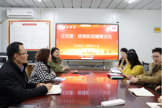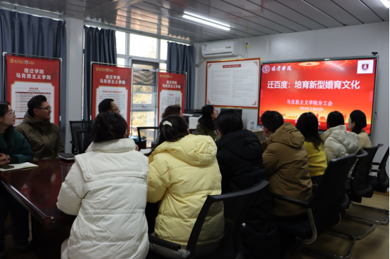 12月16日下午,宿迁学院马克思主义学院分工会于学院二楼会议室举办“迁百度:培育新型婚育文化”专题讲座。本次讲座特别邀请马克思主义学院副院长陈丽杰教授主讲,陈丽杰以青年人关注度极高的婚姻类综艺《再见爱人》为切入,开展“树立健康的婚恋观”为主题的讲座分享,学院青年教师代表参加会议。