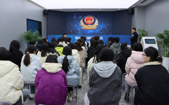 在开泰港湾警企综合服务中心,宿迁市公安局刑事警察支队的民警们向师生们介绍到,警企中心作为连接公安机关与企业之间的桥梁与纽带,拥有实现法制教育基地、党建活动基地、禁毒宣传驿站等功能。同学们在现场通过情景模拟感悟谨防电诈、禁毒的重要性与必要性。在防诈骗专题讲座环节,反诈民警结合校园高发的真实案例,深入浅出地讲解了冒充客服、刷单返利等常见诈骗类型,帮助同学们明确电信诈骗的犯罪性质、社会危害性、法律后果等。