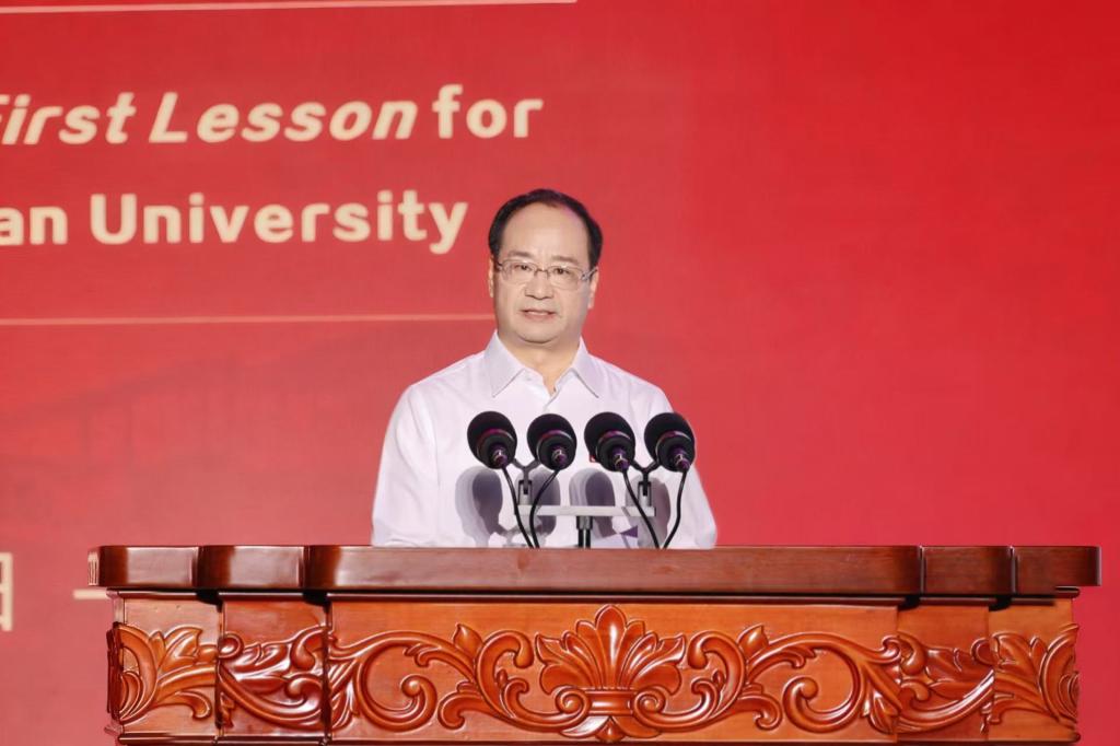 潘志明用“学何以始?志为起点”“学何以进?勤作阶梯!”“学何以成?知行合一!”三问三答和新生交流了学习的思考与期望。他表示,立志奋进才能筑梦青春,希望同学们要立“强国有我”之志、立“服务社会”之志、立“成就自我”之志,为实现人生梦想努力奋斗。潘志明指出,大学学习,贵在勤奋,重在坚持。同学们要勤于一点一点积累,积微成著;要勤于一遍一遍练习,熟能生巧;要勤于一个一个钻研,刨根问底。他希望同学们要在学科竞赛中提升专业技能、在实习实训中锤炼应用本领、在社会实践中增长见识才干,做到学以致用、知行合一。