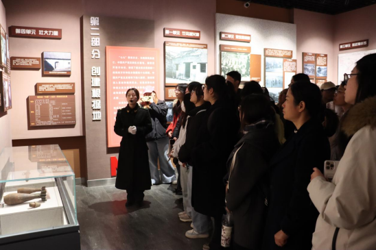 在新四军四师指挥部旧址,师生们驻足于当年指挥员办公、议事的简陋房间,凝视着桌上的油灯、地图和公文包等实物,仿佛穿越到了烽火连天的抗战岁月。唐献玲副院长结合史料,为同学们解读了淮北抗日根据地在战略布局、群众工作、统一战线等方面的重要实践,强调革命先辈们坚持实事求是、依靠群众的工作方法,对当代青年成长成才具有重要的启示意义。