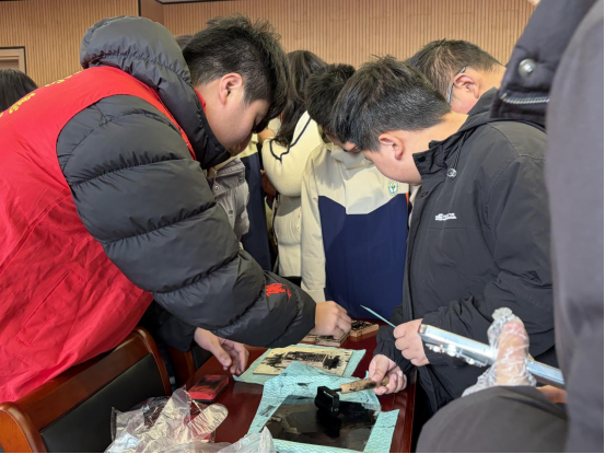 活动现场,志愿者们提前准备好各类拓印工具,结合特殊学生的身心特点,精心设计了简便易行的操作环节。在志愿者“一对一”的耐心辅助下,孩子们依次完成铺纸、蘸墨、按压、揭纸等步骤,亲手体验非遗拓印的完整流程。志愿者们细致讲解拓印技艺的历史渊源,同时选用贴合当下、寓意美好的祝福语拓片,让孩子们在感受非遗魅力的同时,收获温暖祝福,激发对中华优秀传统文化的好奇与向往。