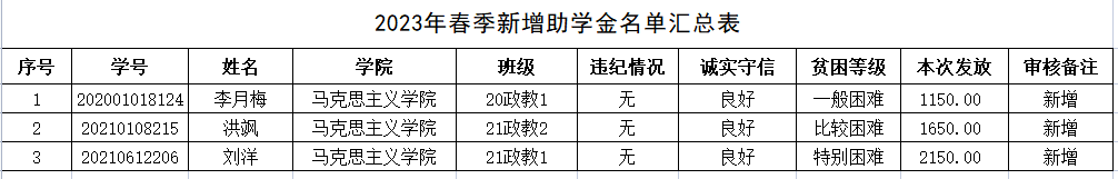 经本人申请,学院组成评定小组评审,2023年度春季新增国家助学金评选工作已经结束,现予以公示,公示时间为2023年2月22日——11月27日。对公示结果如有异议,可以通过来信、来电、来访等形式向学院学生工作办公室2213反映。电话:19552022392。