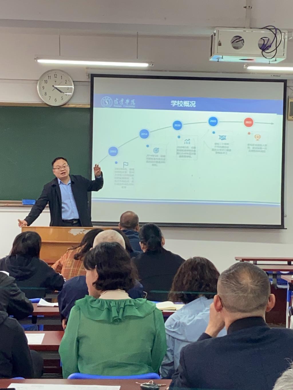 李明建院长从学校概况、本科教学工作基本情况和问题与对策等方面解读了本科教学工作合格评估《自评报告》内容;党总支副书记沈道波从教师和学生两方面强调了教师课堂教学规范。