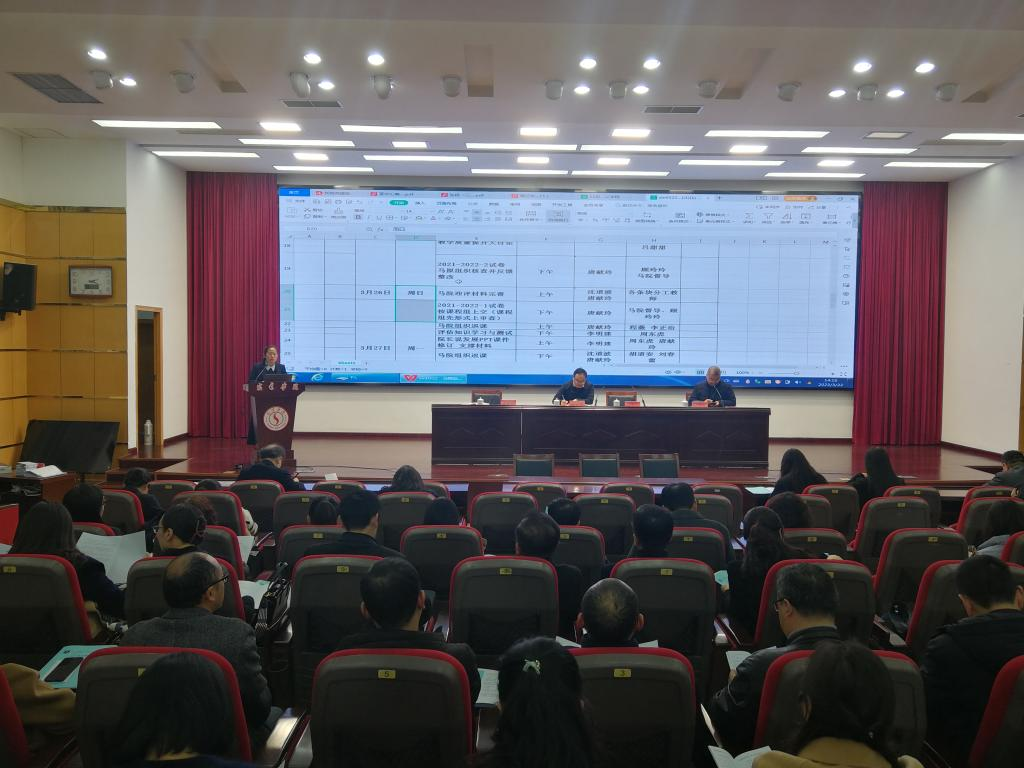 3月22日下午,马克思主义学院在老图书馆报告厅召开专家进校园迎评动员会。院领导班子出席会议,全体教师参加会议。会议由马克思主义学院副书记沈道波主持。 会上,唐献玲副院长传达学校迎评推进会精神,通报了迎评工作各观测点材料整理情况与整改要求,对下阶段迎评工作等提出要求。教务处副处长石鲁生作教学常规工作指导,对教学试卷相关规范情况进行了详细的讲解。李明建院长就本科教学合格评估提出相关要求:一是各系主任和教研室负责人要强化履职尽责;二是再次检查评估涉及的各项材料;三是细化迎评各项流程。
